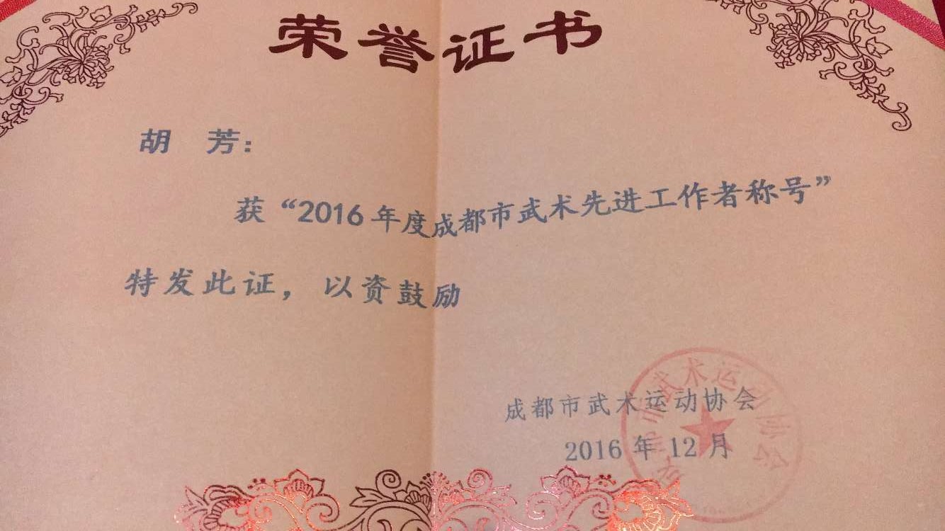 胡芳老师则被授予2016年度“成都市武术先进工作者”称号