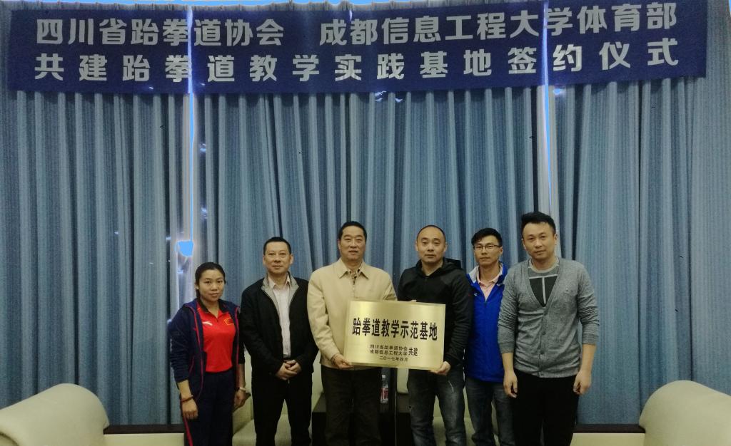 4月14日上午,四川省体育局竞技处副处长康翔、拳跆中心副主任许志刚一行三人在我校体育馆与体育部签订了跆拳道教学实践基地的共建合作协议暨授牌仪式。,省跆拳道协会首期向共建基地提供了十套专业训练设备。