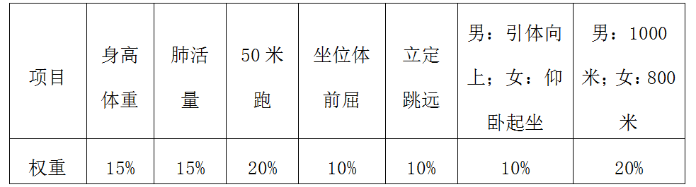 2、学生体质健康测试共有七个项目,其成绩构成权重为: